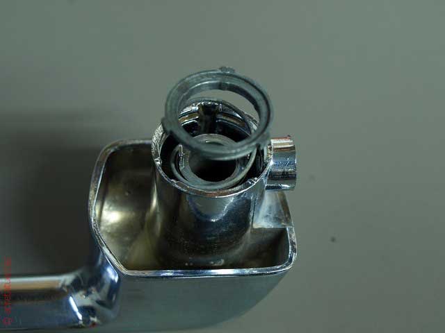 Con un destornillador fino retiramos en primer lugar la pieza de arrastre que tiene forma de U. Para ello giramos el tornillo hacia la derecha (en sentido de las agujas del reloj). La pieza va subiendo poco a poco hasta que se suelta del todo.